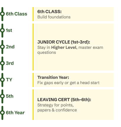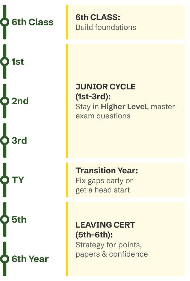We specialise in students from 6th class up to 6th year. Outside that range, we’re usually guessing more than helping — and we’d rather be honest about that.
